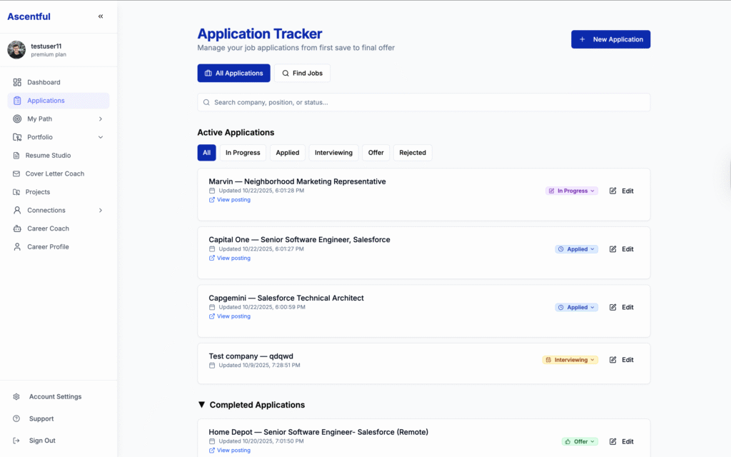 “Before Ascentful, I kept everything in random docs and sticky notes. Now I can see where I’m at with my job search, what’s next, and where I’m falling behind. It doesn’t feel overwhelming anymore.”